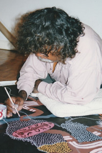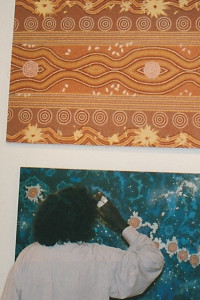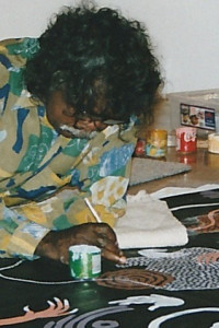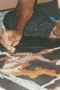 Kids, I see them all the time, painted. All the young fellas they go hunting and the old people there, they do sand painting. They put down all the story, same like I do on canvas. All the young fella they bring 'em back kangaroo. Same all the ladies, they been get all the bush fruit, might be bush onion, plum, might be honey ants, might be yala, all the kungkas (women) bring them back. Because everybody there all ready waiting. Everybody painted. They been using ochres all the colours from the rock. People use them to paint up. I use paint and canvas that's not from us, from European people. Business time we don't use paints the way I use them, no we use them from rock, teach 'em all the young fellas."