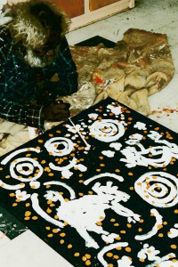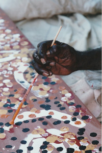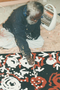 During the 1980’s Johnny became a major force in the Papunya movement, receiving great critical acclaim for his contribution to the recognition of Papunya artists as a mirror for the identification of indigenous culture. In 1984 the director of the National Gallery of Australia, James Mollison, was photographed along side one of Johnny’s works stating that the work of the Papunya artists was ‘the finest abstract art ever produced in this country’. (Sydney Morning Herald, 26/1/84).