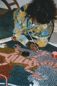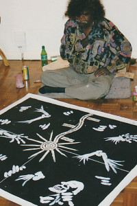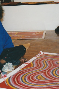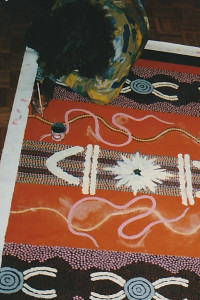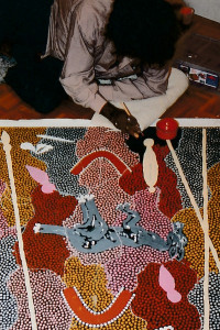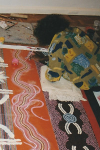 Kids, I see them all the time, painted. All the young fellas they go hunting and the old people there, they do sand painting. They put down all the story, same like I do on canvas. All the young fella they bring 'em back kangaroo. Same all the ladies, they been get all the bush fruit, might be bush onion, plum, might be honey ants, might be yala, all the kungkas (women) bring them back. Because everybody there all ready waiting. Everybody painted. They been using ochres all the colours from the rock. People use them to paint up. I use paint and canvas that's not from us, from European people. Business time we don't use paints the way I use them, no we use them from rock, teach 'em all the young fellas."