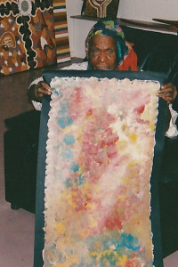 The form that these take in her paintings are lively and moving. Colours merge and change form to communicate a strong cosmological message. She has gone from particular subjects to show abstraction of her complete world, moving her beyond her cultural roots.