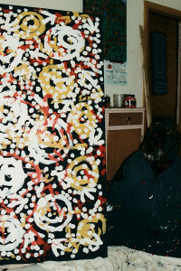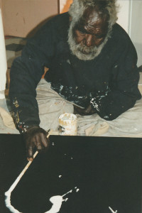 From 1997 – 1999 Johnny painted this story with a new-found freedom, both in expression and in painting technique. Where he was once known for his delicate and soft white dotting, he now attacked the canvas to tell the story with great gusto. He jabbed large dots on to the surface and produced roundels and symbols for weapons with great sweeps of his arm and the brush. Red, black, white. Had he painted in France during the 1950’s he would have been labelled a ‘Taschist’. Johnny is a significant artist who has in some sense retained an authenticity and timeless importance in his work that some of the younger painters are yet to achieve. All great painters, past and present, seem to have an additional level in their work which may defy description. This evasive quality is sometimes born of the synthesis achieved between colour, form, texture and meaning. When viewing paintings by Johnny Warangkula Jupurulla we find ourselves in a position where the recognition of another elemental level is tantalisingly close and for a lucky few the spirit is moved beyond words. In the presence of great visual art, the employment of everyday language can become a futile and unproductive gesture.