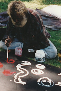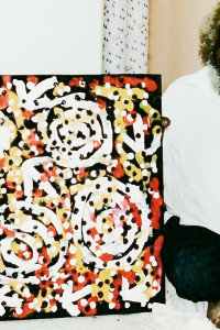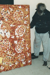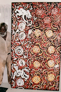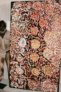 During the 1980’s Johnny became a major force in the Papunya movement, receiving great critical acclaim for his contribution to the recognition of Papunya artists as a mirror for the identification of indigenous culture. In 1984 the director of the National Gallery of Australia, James Mollison, was photographed along side one of Johnny’s works stating that the work of the Papunya artists was ‘the finest abstract art ever produced in this country’. (Sydney Morning Herald, 26/1/84).